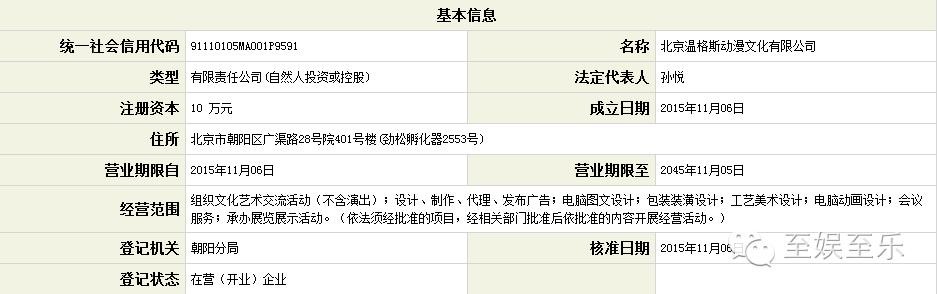 又过了5个月(2015年11月6日),北京温格斯动漫文化有限公司成立,印证了官博5个月前提到的关于战略调整的决定。