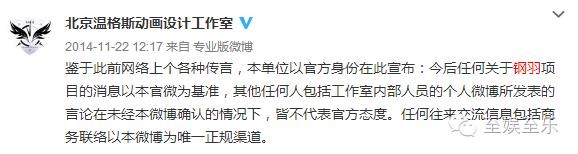 接着,三个月后(2014年11月),就冒出了一个叫“北京温格斯动画设计工作室”的官博,声称钢羽的消息以自己为准,并且钢羽动画化的项目归属于该工作室。