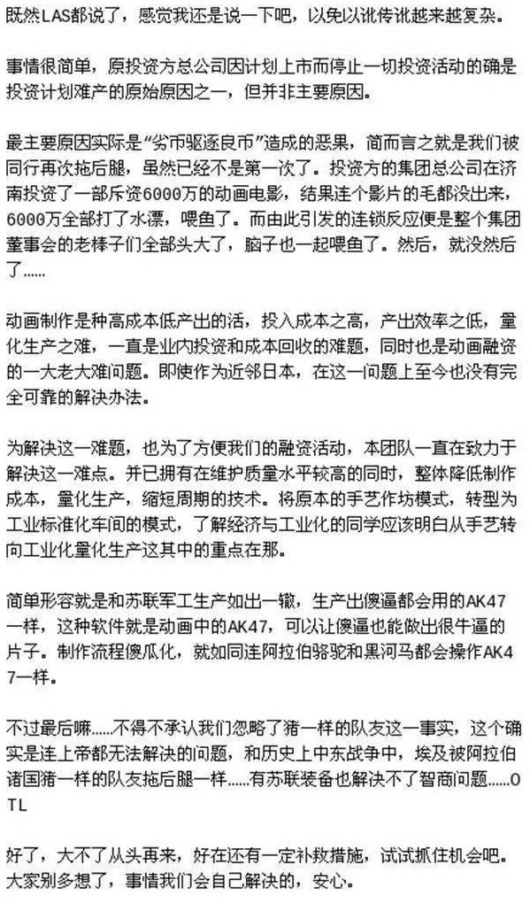 编剧YEKK也发长微博声称遇到了猪队友(因投资失败而连累到了钢羽动画化的投资商)。