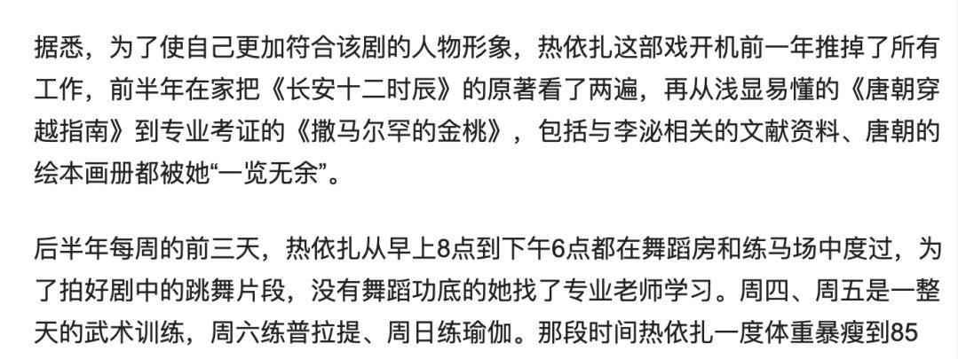随后的几年间,热依扎参与了《长安十二时辰》和《九州·海上牧云记》等剧目的演出。为了完美诠释“檀棋”一角,她不惜暂停手头所有工作,全身心投入,用了一年的时间来广泛学习各种才艺。
