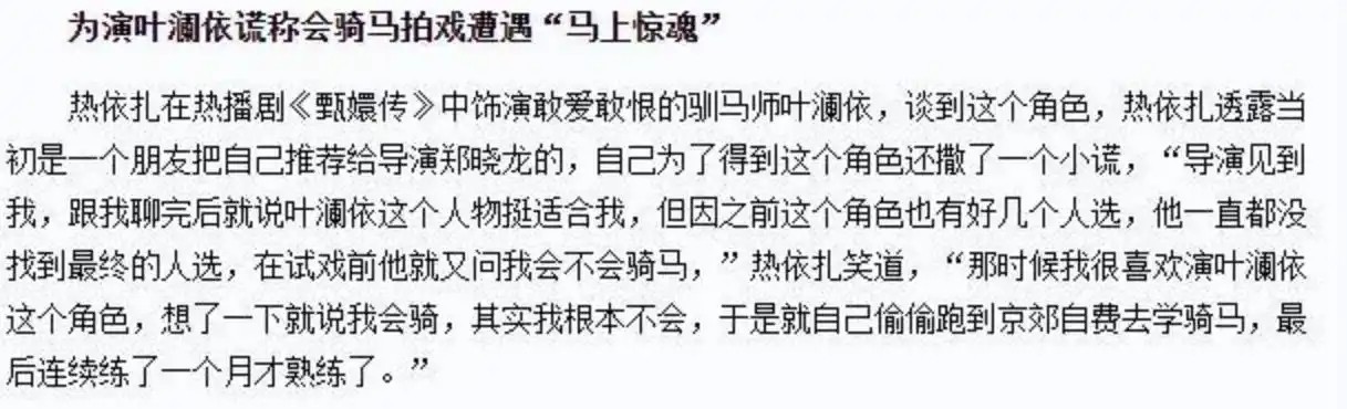 尽管此前她对骑马一窍不通,但为了争取“叶澜依”这一角色,热依扎毅然决然地表示自己“擅长”。