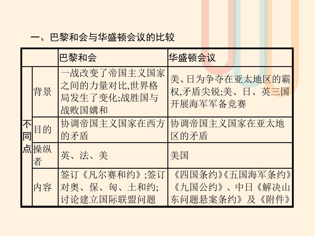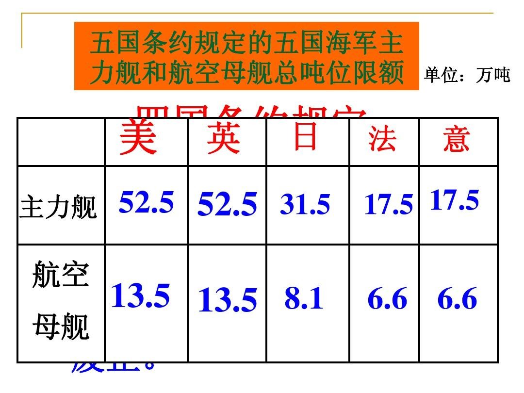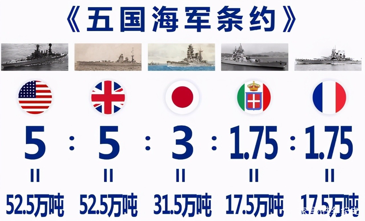 《五国海军条约》:该条约主要解决美英日三国在太平洋地区的军备竞赛,规定了美、英、日、法、意五国海军力量(吨位)比率为5:5:3:1.75:1.75。实际上中心就是美英日三国,法国、意大利海军忙着自己本土周边海域就差不多了,哪有功夫到太平洋来