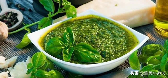 这种酱类是以橄榄油、罗勒/九层塔、帕马森干酪(Parmesan)和蒜泥为底,有谢地方也会添加松子。