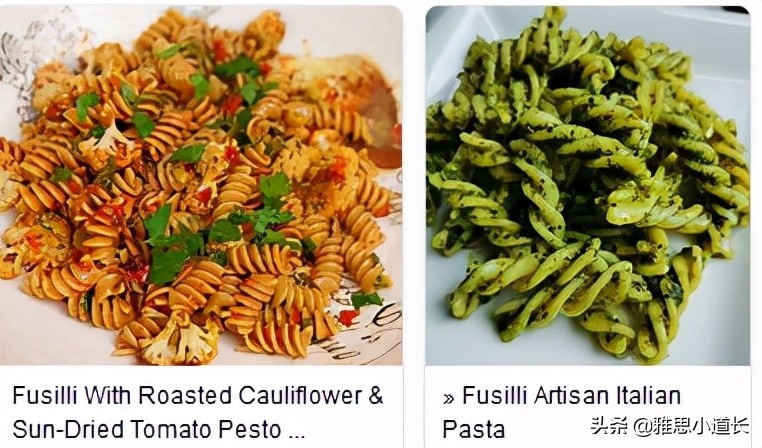 有很多种大小和颜色,适合搭配红酱(肉酱)或白酱(芝士酱)。除了用于做意大利面之外,在制作沙拉时也被经常使用,有各种好看的颜色。