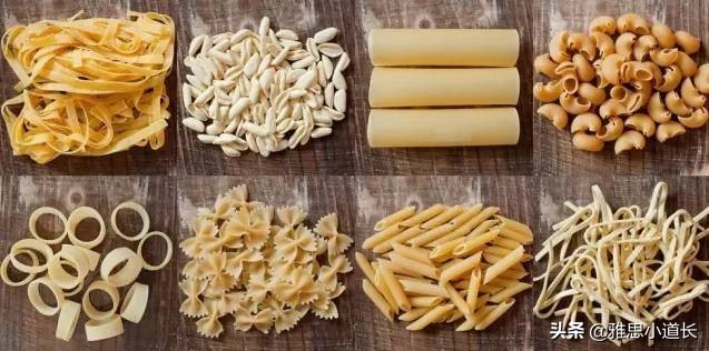 千层面Lasagna、皇后面 Mafalda、窄扁面 Linguine、薄宽面 Tagliatelle、吸管面 Bucatini、米粒面 Orzo、星星面 Stelline、层层面 Radiatore、猫耳朵面 Orecchiette、车轮面 Rotelle、贝壳面 Conchiglie........