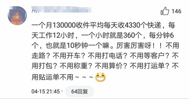 “一个月13万件,平均每天收4330个快递,按每天工作12小时来计算,一小时就是360个,每分钟6个,相当于10秒钟(处理)一个,这也太快了吧”,一位跟贴的网友忍不住为算了这样一笔账。
