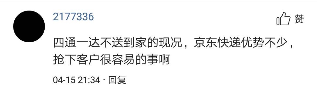 有网友认为,“四通一达不送到家的现况,京东快递优势不少,抢下客户很容易的事啊。”