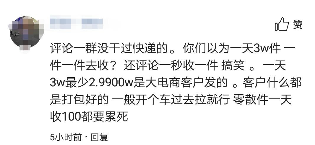 “你们以为一天3W件一件一件去收?还评论一秒收一件搞笑。一天3W最少2.99W是大电商客户发的。客户什么都是打包好的,一般开个车过去拉就行。零散件一天收100都要累死。”另一网友补充表示。