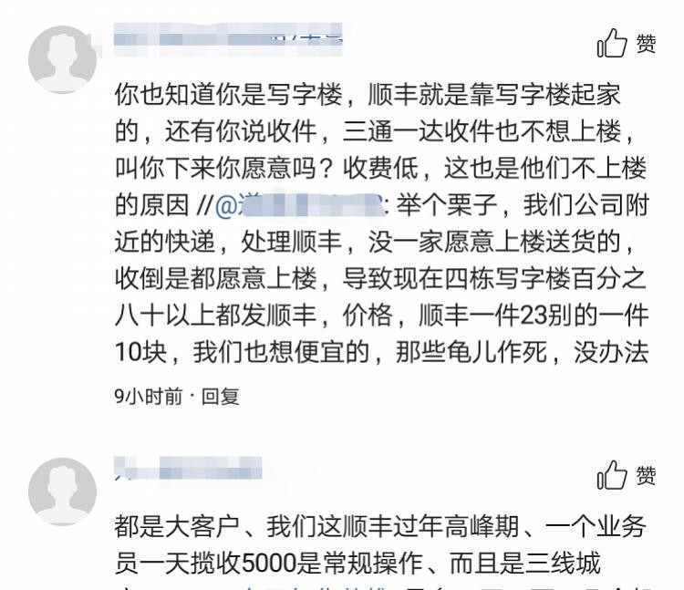 “我们公司附近的快递,除了顺丰,没一家愿意上楼送货的,收倒是都愿意上楼,导致现在四栋写字楼百分之八十以上都发顺丰,价格,顺丰一件23别的一件10块,我们也想便宜的……没办法。”