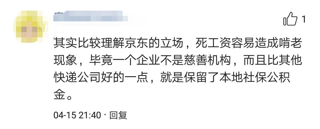 不过,也有跟帖的网友表示,“其实比较理解京东的立场,死工资容易造成啃老现象,毕竟一个企业不是慈善机构,而且比其他快递公司好的一点,就是保留了本地社保公积金。”“大锅饭肯定不行,人的积极性发不出来,优胜劣汰!”