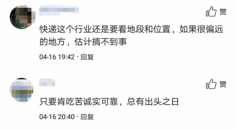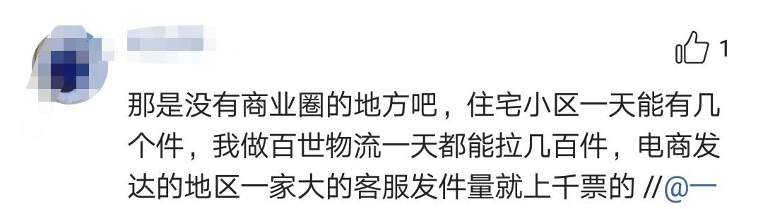 一位网友表示,揽件数量区域性差异巨大,“快递这个行业还是要看地段和位置,如果很偏远的地方,估计搞不到事。”“住宅小区一天能有几个件,我做百世物流一天都能拉到几百件,电商发达的地区一家大的客服发件量就上千票的。”一位快递业网友留言这样表示。