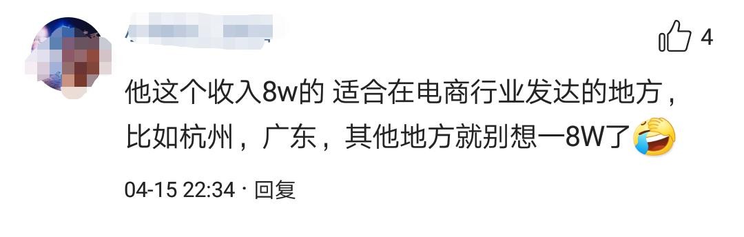 而这一位网友则分析认为,“他这个收入8W的(京东快递员),适合在电商行业发达的地方,比如杭州,广东,其他地方就别想8W了。”