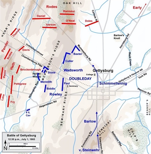 1863 年 7 月 1 日凌晨,当第1骑兵师的一个侦察队收到南方军正在从葛底斯堡以西逼近的消息时,布福德准将召集了他的2,700 名骑兵。布福德的特使已向所有四个方面的军团指挥官发出消息,称他们“遇到了南方邦联的步兵”,但布福德认为主要步兵军团还需要几个小时才能到达。