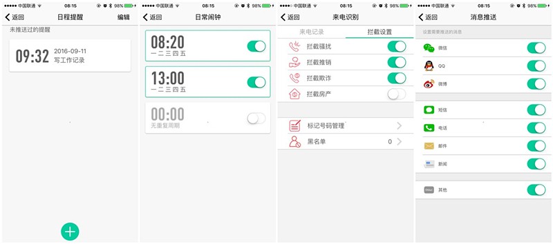 除此以外,比如日程提醒、日常闹钟、来电识别、消息推送等功能,小黑3的APP也是通通具备。