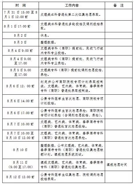 6、7月30日,填报文理类本科普通批、春季高考本科第二次征集志愿,填报艺术类本科B段征集志愿,填报高职院校专项计划、文理类、艺术类、体育类、春季高考专科(高职)普通批首次志惠。
