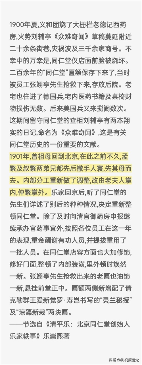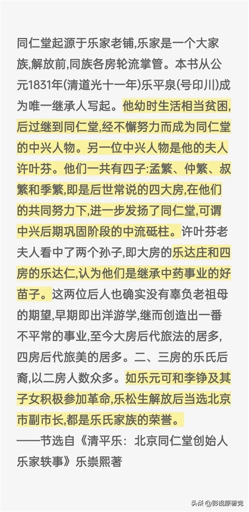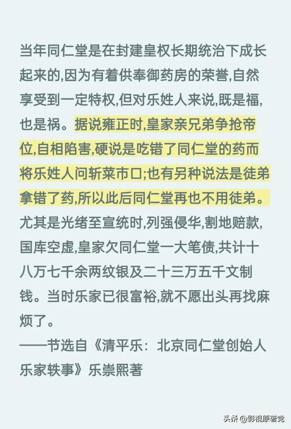 乐家起源于山西太原,历史上有名的乐羊子据说也是乐家先祖,而清朝康熙年间,乐家第四代子弟乐显扬和其子乐凤鸣在北京开设了同仁堂药店,凭着过硬的技术与钻营,很快就成了清朝皇室的御用药商,但雍正年间同仁堂被卷入了政治斗争,乐家人因为“抓错药”的罪名被判了死刑。。。和《大宅门》里白颖园被害“死”的情节类似。