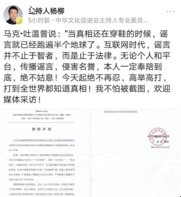 外界传言杨柳有过五次婚姻,而本人回应只有三次,杨柳曾发表一张2015年的律师声明怒斥造谣者,声称自己已经被5次婚姻的不实信息中伤了7年之久。虽然自己一直在向造谣者发送律师函,但依然没能阻止谣言的传播。