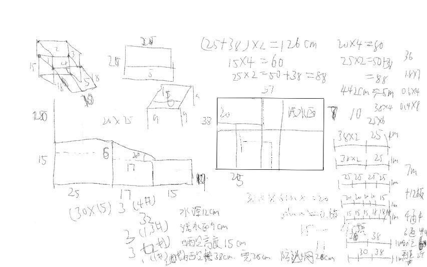 计划做一个38x25,高15的的晒台,在做一个38x15,高9的浅水台,最后水位可以升至13左右。设计了图纸,计算了材料量和种类。手画的,大家看个示意就好,