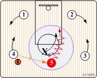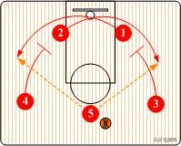 小前锋将球传入内线后,就移动到另一侧为大前锋(4)作掩护让他有机会摆脱防守队员。而这时控球后卫则可以寻找底线突破的后门。