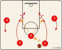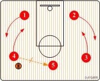 既可以由控球后卫(1)将球传给小前锋(3),然后从里侧切入到底角