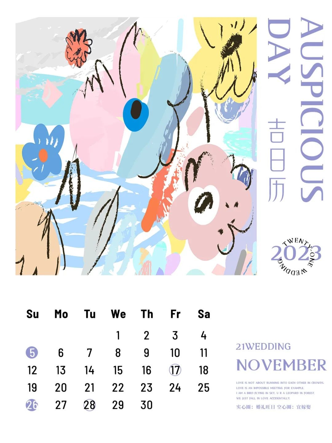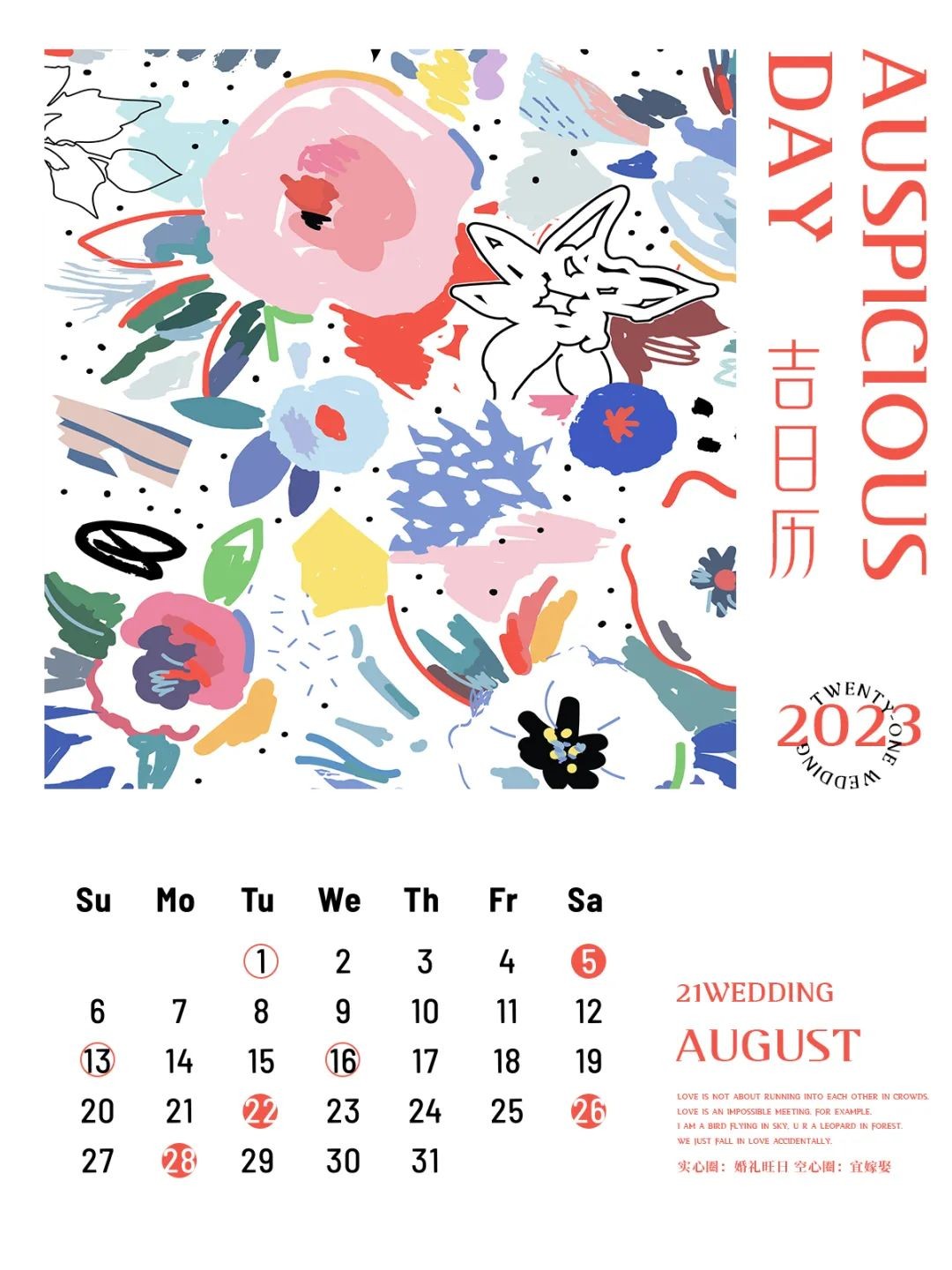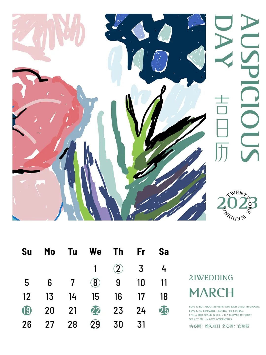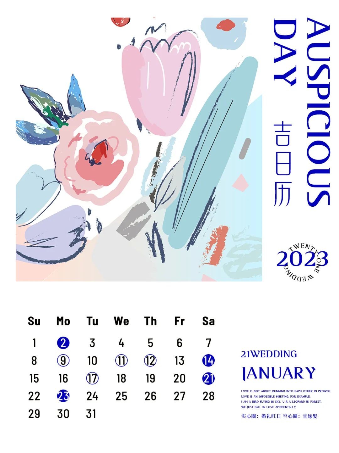 注:2023年的吉日历,我们以中华万年历和黄道吉日为蓝本,以婚礼旺日(first choice)、宜嫁娶(second choice)、空白三种形式进行标注。