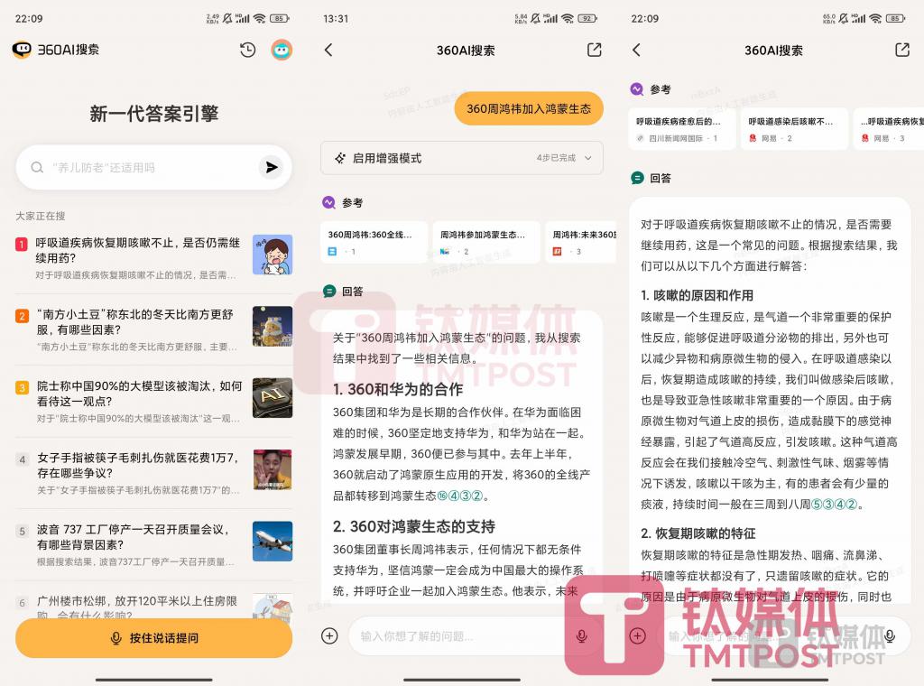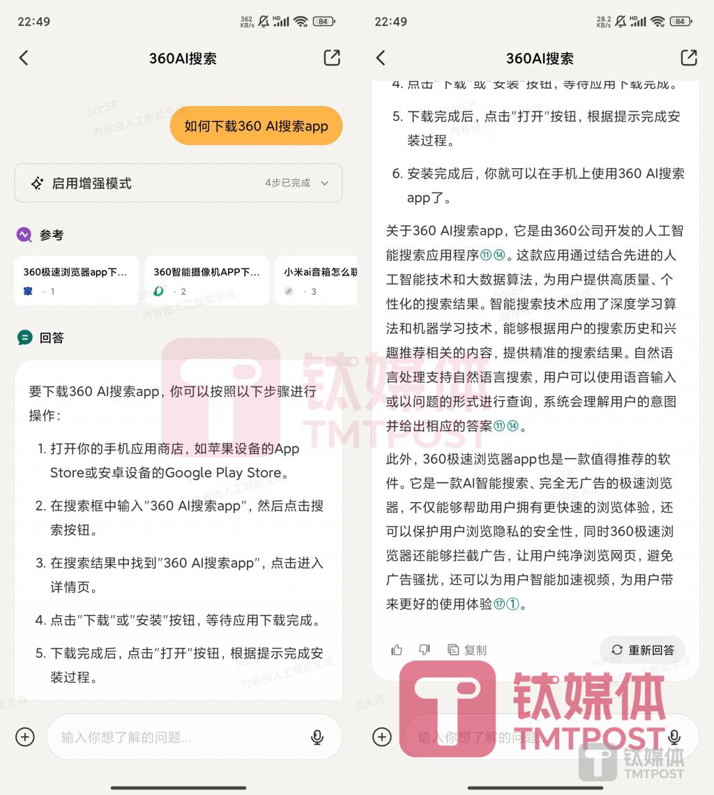 1 月 29 日消息,钛媒体 App 独家获悉,360 集团(SHA: 601360)全新升级的大模型搜索产品 "360 AI 搜索 " 移动 App 日前正式上架多个安卓应用商店中,版本为 1.0.0。