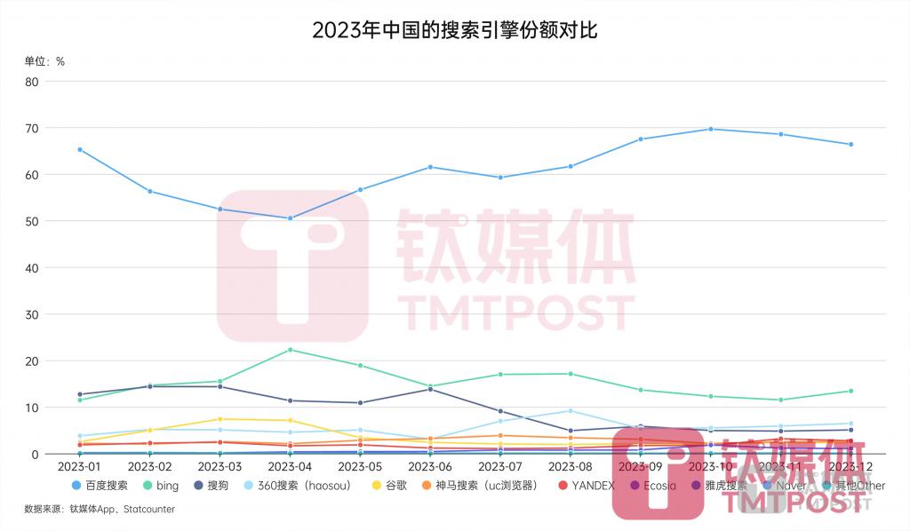 据 Statcounter 最新数据显示,截至 2023 年 12 月,百度在中国的搜索引擎市场份额为 66.52%,排名第一;必应国内版份额为 13.32%,360 搜索排名第三,份额为 6.43%,超越了腾讯的搜狗 5.01% 的搜索份额。