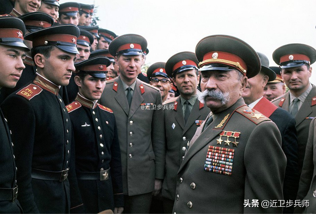 比如上图中,据称摄于1970年,中间的这位就是老骑兵元帅布琼尼,没错这时候他还活着。布琼尼身后的这些苏军军官穿的就是1969年条例军装,不熟悉这套军服的网友可以看一下,这种军服的设计就是用红色的帽瓦和领章来代表陆军的合成军。