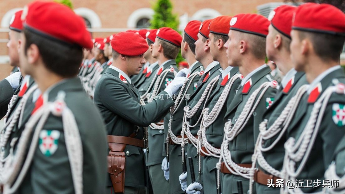 另外还有一些国家,比如奥地利军队,采用不同颜色区分不同的兵种,有些兵种,比如军医、技术、军校、通信、炮兵/防空、仪仗都是红色系,尤其是仪仗部队,一般佩戴红领章出镜,比如下图所示。