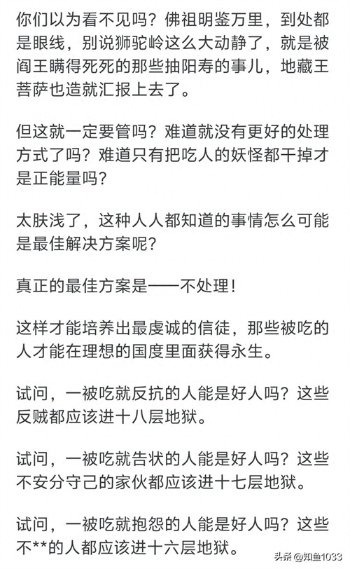 3.这个,说得好有道理一样,无法辩驳也就是说,我是神,你们是众生,你们人、魔、鬼、怪,互啄,关我鸟事,我不管。这才是神佛心中的的众生平等。