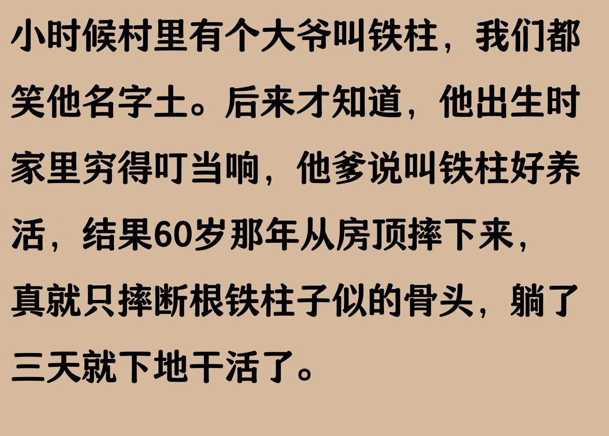 小时候村里有个大爷叫铁柱,我们都好奇为啥叫这名。他爸说那年他出生时家里穷得叮当响,正好门口有根生锈的铁柱子,他爸说就叫这个吧,铁打的结实。结果前年发大水,大爷抱着那根铁柱子撑了一天一夜,真被救了一命。