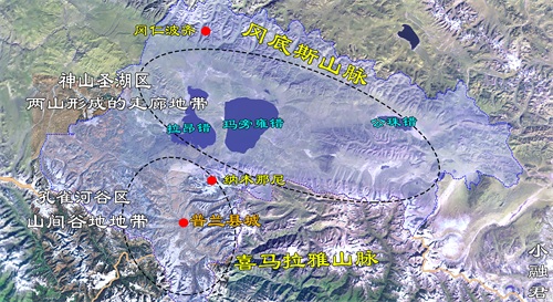 普兰县地处阿里南部,它的地形可以分为两个部分。首先,冈底斯山脉和喜马拉雅山脉在这里贴近,形成了一条狭长的走廊,中间夹着三个大型湖泊,我们可以称这里为“神山圣湖区”。