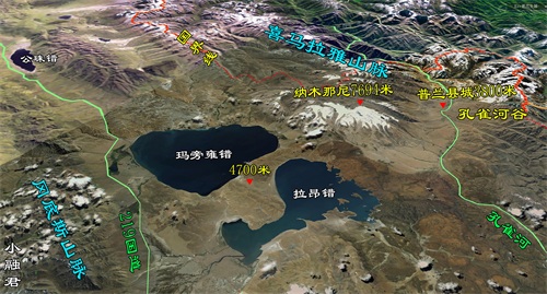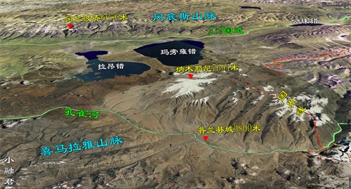 在南面的喜马拉雅山上,矗立着海拔7694米的纳木那尼峰,也是阿里地区最高峰,它隔着两座湖泊,和冈底斯山脉的冈仁波齐峰对峙。