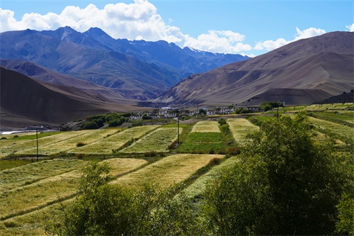 从孟加拉湾吹来的暖湿气流到达这里,形成了宜人的小气候,在孔雀河两岸,可以看到茂盛的青稞,金黄的田地,因此,这里也被称为“阿里小江南”。