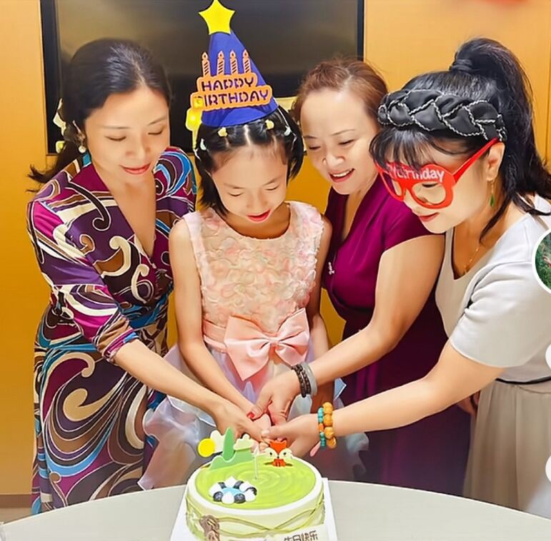 女儿脸上涂着蛋糕,满脸笑容。来给孩子庆生的,还有李丹阳的3位女性朋友。