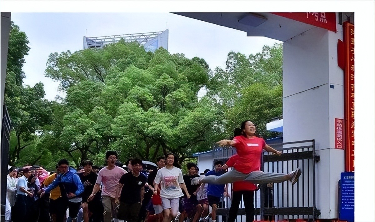 冲在第一个的是一个穿着红衣服的女生,她跑在人群的第一个,出校门的时候,她还兴奋地在空中做起了一字马。这一幕被现场的记者各个角度抓拍到了,现场的人都被这个女生的状态感染。