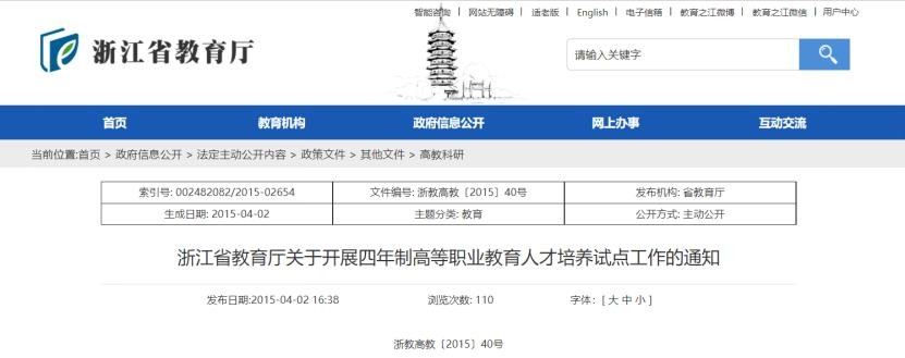 浙江省关于开展四年制高等职业教育人才培养试点工作的通知 图源/浙江省教育厅官网