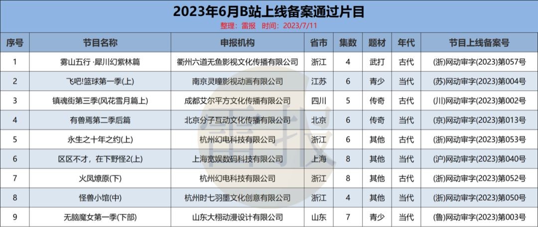 B站有9部网络动画片通过6月上线登记备案。分别是《雾山五行 ·犀川幻紫林篇》、《飞吧!篮球第一季(上) 》、《镇魂街第三季(风花雪月篇上)》、《有兽焉第二季后篇》、《永生之十年之约(上) 》、《区区不才,在下野怪2(上) 》、《火凤燎原(下) 》、《怪兽小馆(中) 》、《无脑魔女第一季(下部) 》。