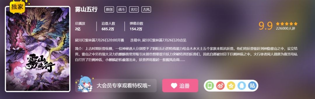 《雾山五行·犀川幻紫林篇》是热播番剧《雾山五行》的续篇,出品方为六道无鱼动画工作室、好传动画、bilibili,制作方为六道无鱼动画工作室。好传动画曾获光线传媒和青瓷游戏投资,光线传媒持股27%,青瓷游戏持股2%。《雾山五行》于2020年首播,在B站上线首日就冲上了站内热搜第一,豆瓣评分一度高达9.3分。目前该动画在B站播放量高达2亿,并获得了690.4万追番,站内评分9.9分。