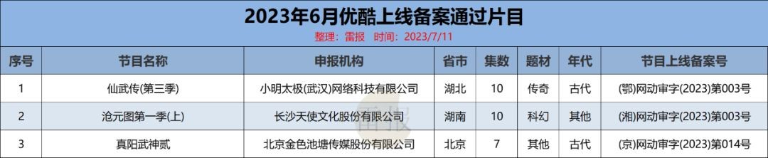 优酷6月通过上线登记备案的动画共3部,分别是《仙武传(第三季)》、《沧元图第一季(上) 》、《真阳武神贰》。