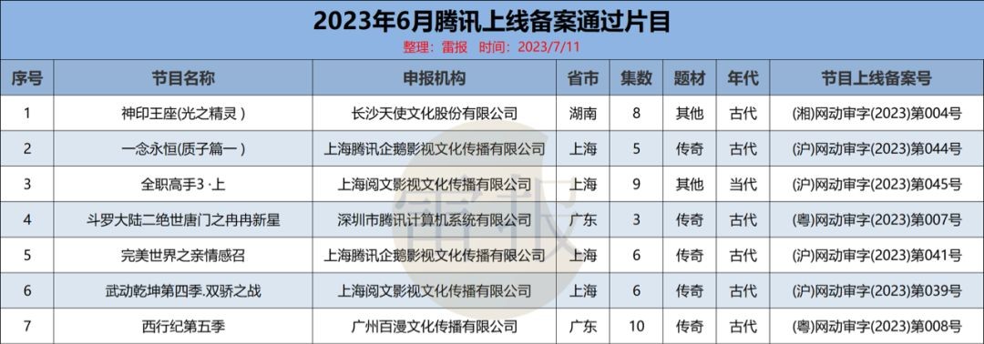 6月通过上线登记备案的29部动画中,腾讯占7部,分别是《神印王座(光之精灵)》、《一念永恒(质子篇一) 》、《全职高手3 ·上》、《斗罗大陆二绝世唐门之冉冉新星》、《完美世界之亲情感召》、《武动乾坤第四季.双骄之战》、《西行纪第五季》。