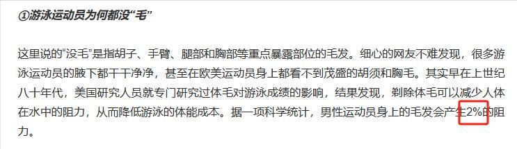 别看这只是2%,但在国际比赛上,别说几秒钟,零点几秒都有可能让运动员错失冠军,因此为了获得更好的成绩,无论男还是女,都必须在赛前剃掉脸部、腿部、手臂、腋下、胸部的毛发。