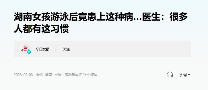澎湃新闻账号“今日女报”2023.8.3《湖南女孩游泳后竟患上这种病…医生:很多人都有这习惯》