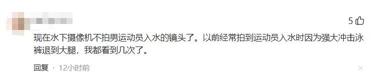 尽管泳裤已经非常非常紧了,但巨大的冲击力还是会将泳裤冲击到大腿根部,这是一件非常尴尬的事情,因此如今很多体育赛事在转播时会避免拍摄运动员入水瞬间水底的镜头。