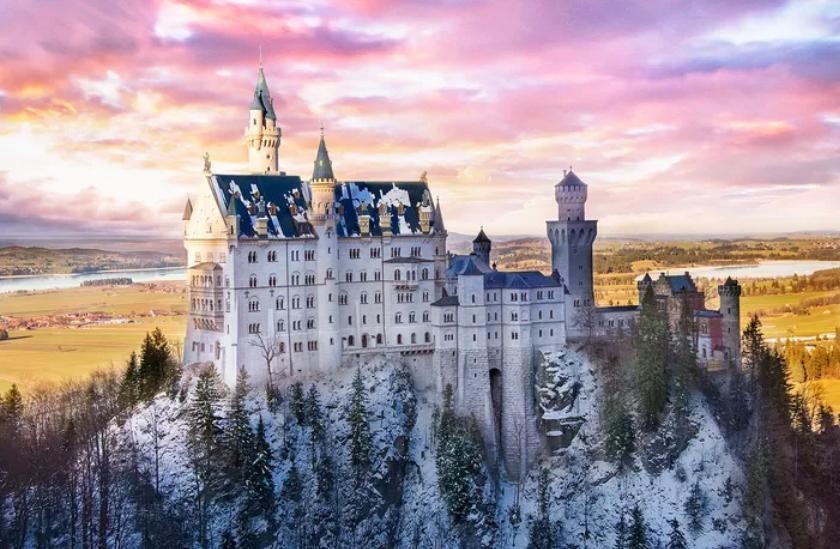 新天鹅城堡位于今天的德国巴伐利亚西南方,邻近年代较早的高天鹅城堡,距离菲森镇约4公里,离德国与奥地利边界不远。这座城堡是巴伐利亚国王路德维希二世的行宫之一。共有360个房间,其中只有14个房间依照设计完工,其他的346个房间则因为国王在1886年逝世而未完成,在他死后的七个星期,城堡向公众付费开放。是德国境内受拍照最多的建筑物[2]。同时也是最受欢迎的旅游景点之一,在6月到8月的旅游旺季平均每天接待超过6000人,高峰人数近万人。每年约有150万来自世界各地的游客前来参观新天鹅堡,感受其无穷的魅力,并被其深深吸引。这座理想化的浪漫主义建筑与其主人悲惨的生活经历有着千丝万缕的联系,令来自世界各地的游客为之着迷。