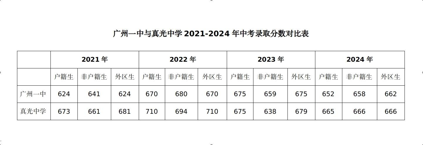 由此可见,除了2023年非户籍生的录取分数线,广州一中(659)比真光中学(638)略高外,其余年份的户籍生、非户籍生、外区生录取分数线,广州一中均比真光中学低。