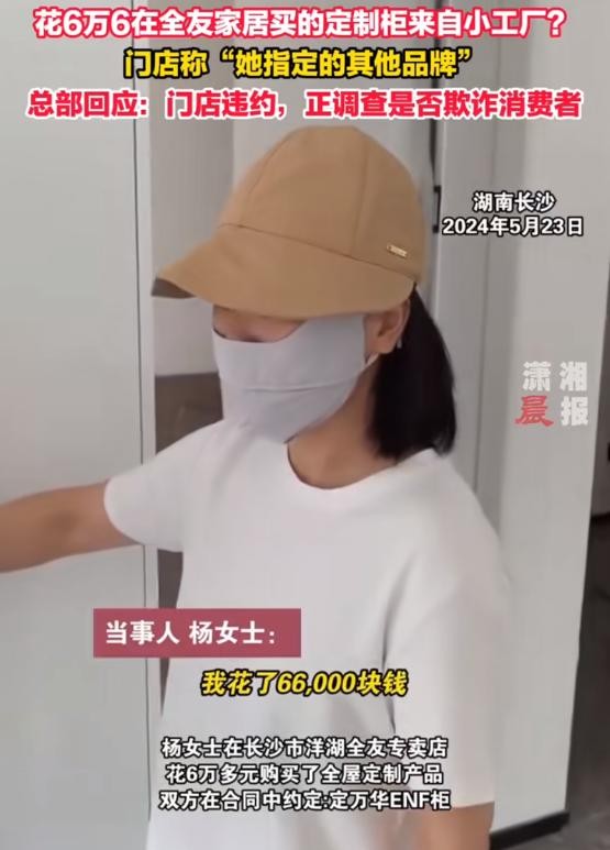 5月23日报道,长沙市居民杨女士在全友家居洋湖专卖店花费6.6万元购买了全屋定制柜,但收到货后发现产品并非全友制造。