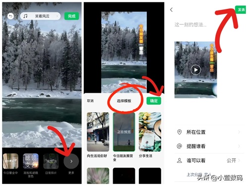 如果你不喜欢,还可以选择底部各种各样丰富多彩的模板,点击更多进入,这里就可以挑选出来你喜欢的,点击一下就切换到你满意的模版,点击确定,点击完成就跳转到发布朋友圈的界面,就可以直接发表了。