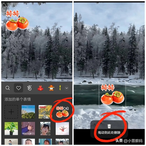 第一个就是添加表情,就可以选择合适的表情添加上去了,还可以移动表情到合适的位置上,不喜欢的还可以按住它拖动到底部进行删除。