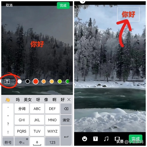接着就是添加文字,想给视频添加文字,就点击T图标,就可以输入文字,还可以给文字添加颜色,然后移动文字到合适的位置,不影响视频的观看。